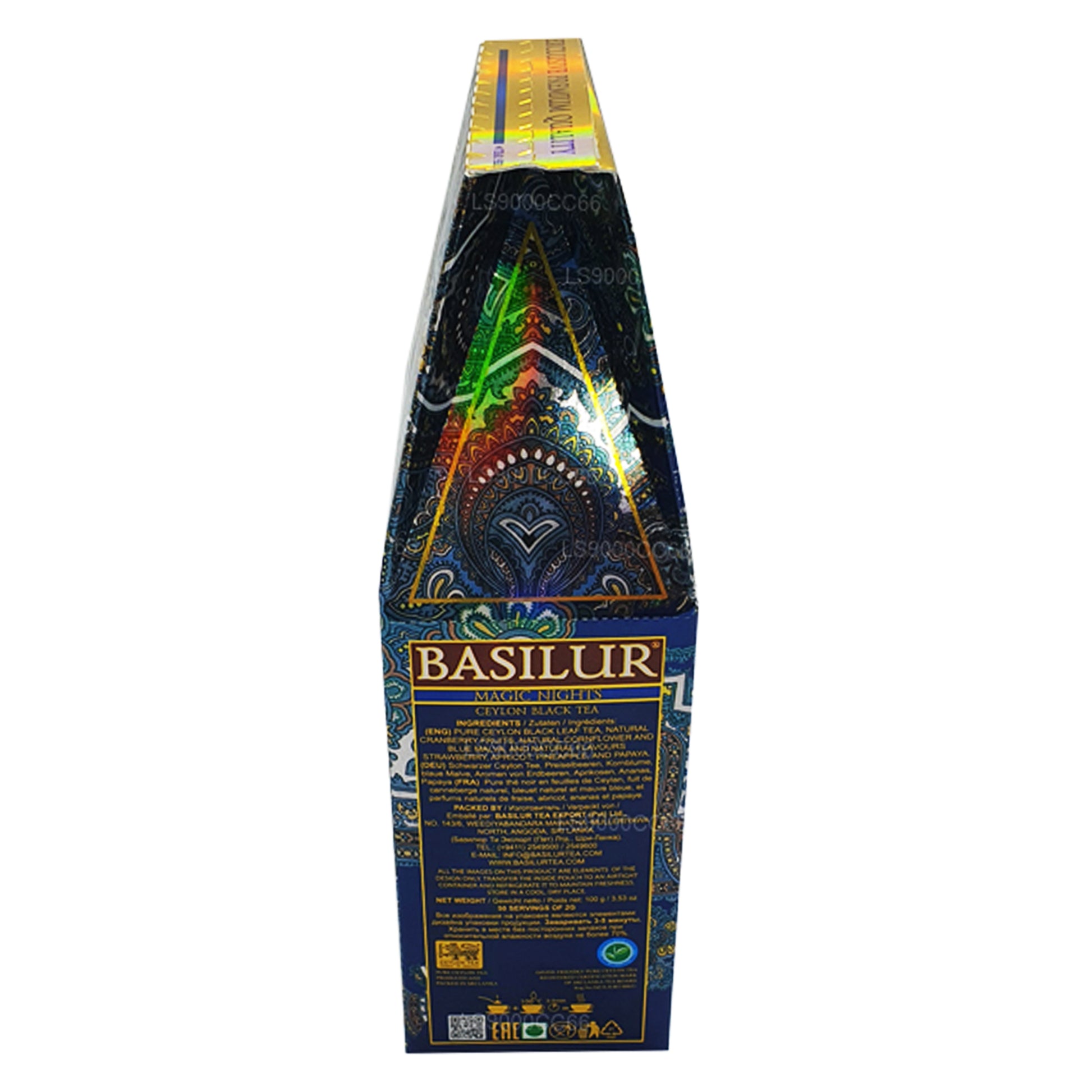 100% Pure Ceylon black leaf tea, natural cranberry fruits, natural cornflower, and blue malva, and flavors strawberry, apricot, pineapple, and papaya. Basilur presents to you a special blend of Ceylon Black tea with natural fruits and herbs beyond imagination. Each cup will invigorate your soul and leave you fulfilled with the crisp aroma reminiscent of the all-natural goodness of Ceylon’s finest.100g loose/leafy tea packed into a foil pouch with a zipper lock.