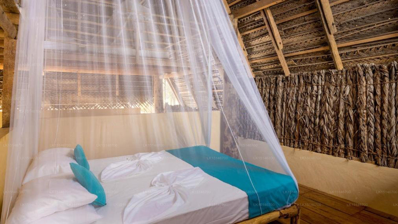 The resort features uniquely designed villas and palm tree houses constructed from sustainable materials like coconut palm wood and thatched roofs. Each unit is naturally ventilated, offering open-air bathrooms, scenic lounges with hammocks, and private patios. Accommodations are designed to harmonize with the environment, providing a rustic yet comfortable stay.