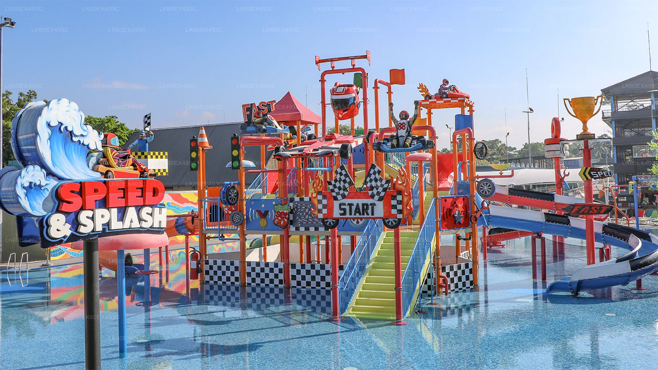 - (A) Speed + Splash Combo: Unlimited waterpark access for the day, 10-minute karting session (average of 10 laps), lap time tracking, helmet, shower cap, gloves, swimming pool, and basketball.