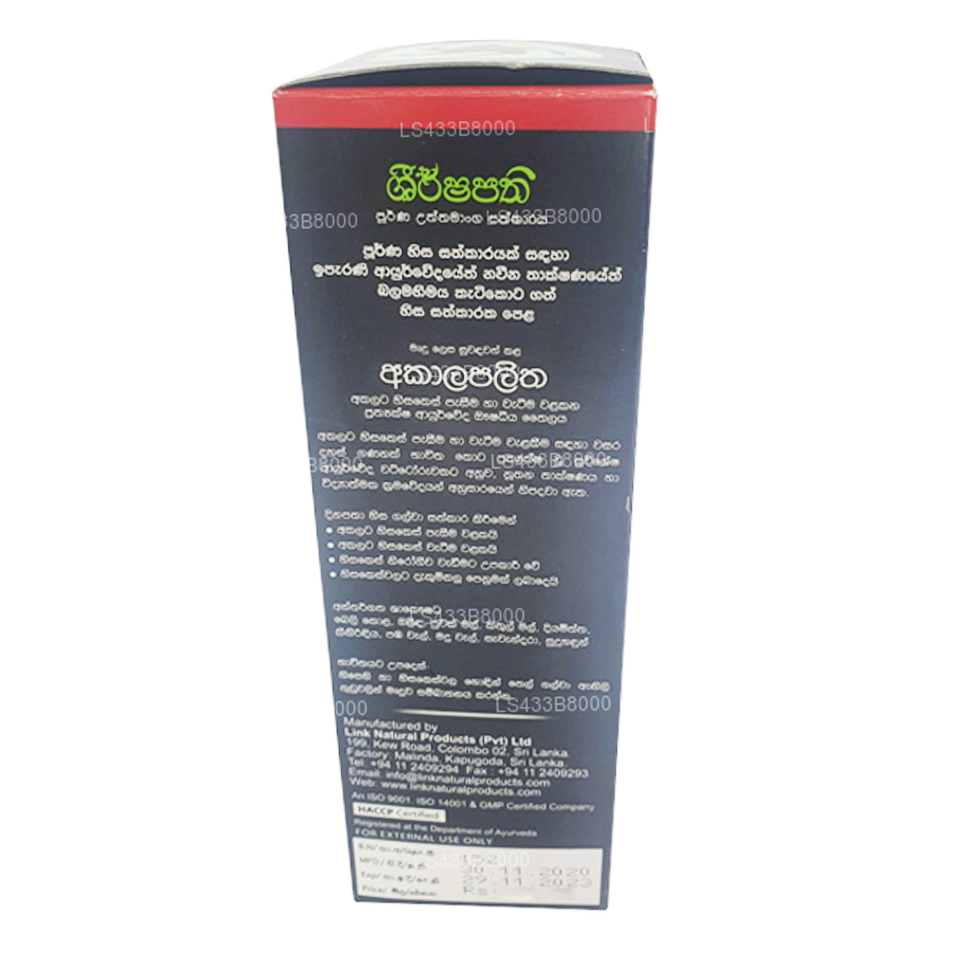 Ingredients: Keekirindiya (Eclipta alba (L.) Hassak.), Kithul (Caryota urens Linn.), Puwak (Areca catechu Linn.), Madhu (Merremia tridentate (L.) Hall.f.), Beli (Aegle marmelos (L.) Corr.), Pamba (Lygodium flexuosum (L.) Sw.), Diyamitta (Cissampelos pareira L.), Olinda (Abrus precatorious Linn.) Savendara (Vetiveria zizanioides (L.) Nash.), Suduhandun (Santalum album Linn.)