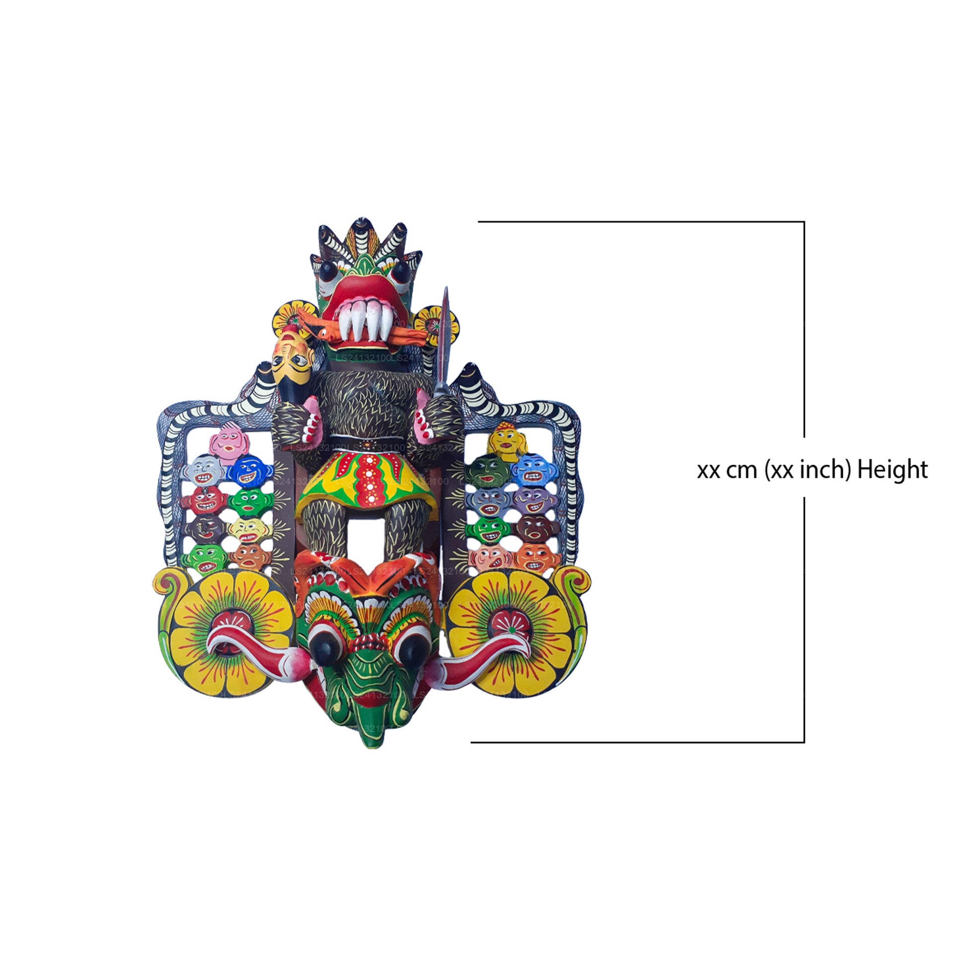 The 18 masks in this collection are part of the traditional Sanni Yakuma ritual, each representing a different aspect of the demon Maha Kola Sanni. The central, larger mask features all 18 smaller masks within it, symbolizing the complete presence and power of the demon in the ceremony. This showcase highlights the intricate craftsmanship and cultural significance of Sri Lanka’s ritualistic mask traditions.