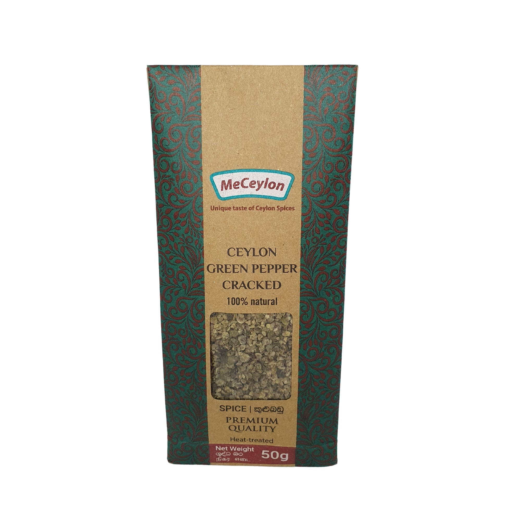 Me Ceylon Ceylon Green Pepper Cracked contiene bacche acerbe di Piper nigrum raccolte precocemente per preservare il loro sapore fresco e croccante, quindi spezzate delicatamente per rilasciare oli aromatici senza macinarle in polvere fine. Più delicato e meno pungente del pepe maturo, offre note croccanti e leggermente fruttate che esaltano frutti di mare, salse, insalate e piatti leggeri. Prodotto da MecEylon utilizzando pratiche di approvvigionamento sostenibile in Sri Lanka, questo peperone verde spezzato porta un calore brillante e sfumato nella tua cucina. Ideale per i buongustai e gli chef che cercano un condimento pulito e aromatico senza additivi