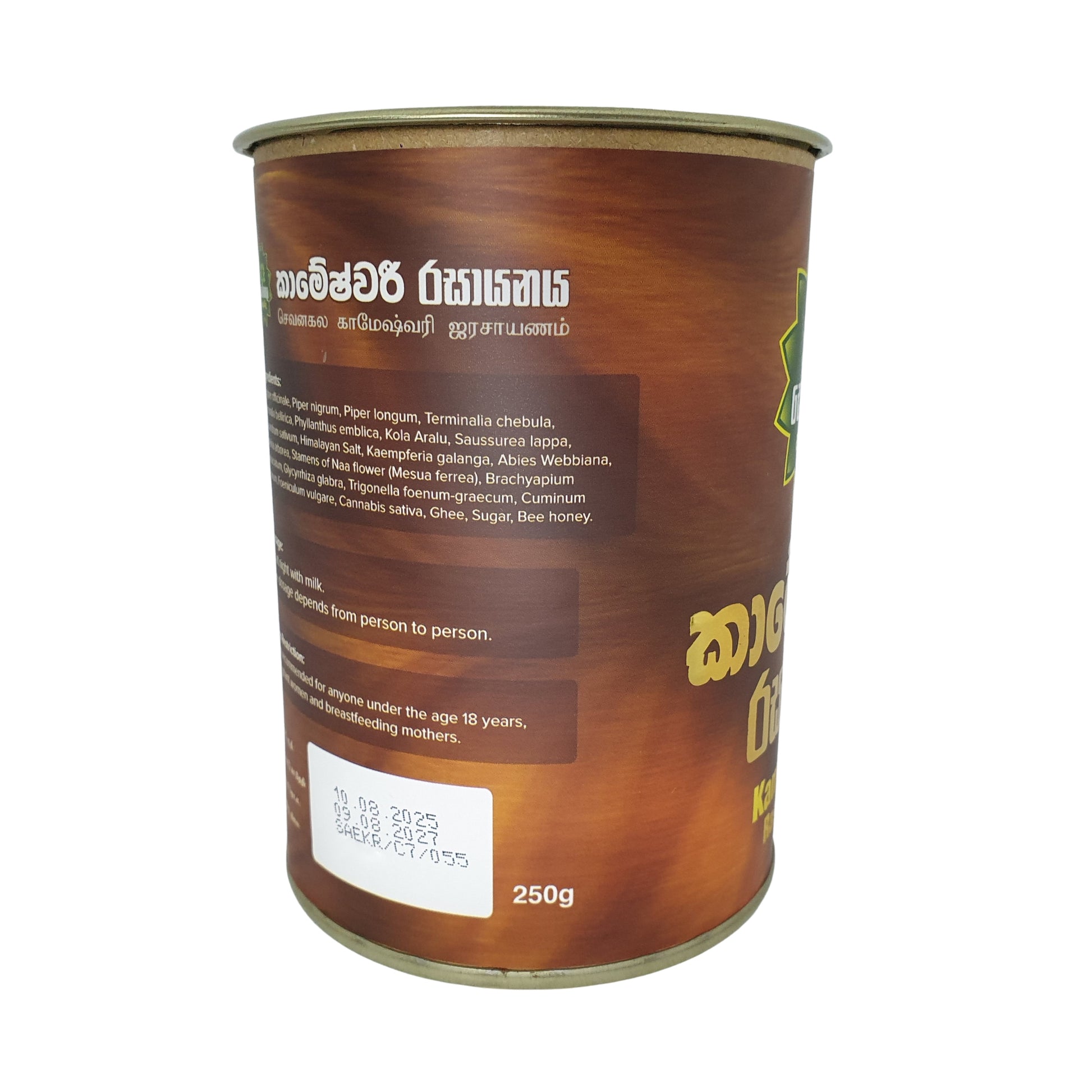 Carefully prepared with a rich blend of natural ingredients, pepper (Piper nigrum), ginger (Zingiber officinale), tippili (Piper longum), nelli (Phyllanthus emblica), cumin (Cuminum cyminum), fenugreek (Trigonella foenum-graecum), coriander (Coriandrum sativum), neem (Azadirachta indica), fragrant pods, savinda salt, thalisa leaves, ivory bark, namal renu, heen anise, great anise, licorice (Glycyrrhiza glabra), black cumin, cardamom (Elettaria cardamomum), cinnamon bark, teja leaves, hemp seeds roasted in ghee, honey, and sugar (twice the weight) this traditional Rasayana delivers a powerful combination of nourishment, strength, and holistic well-being.