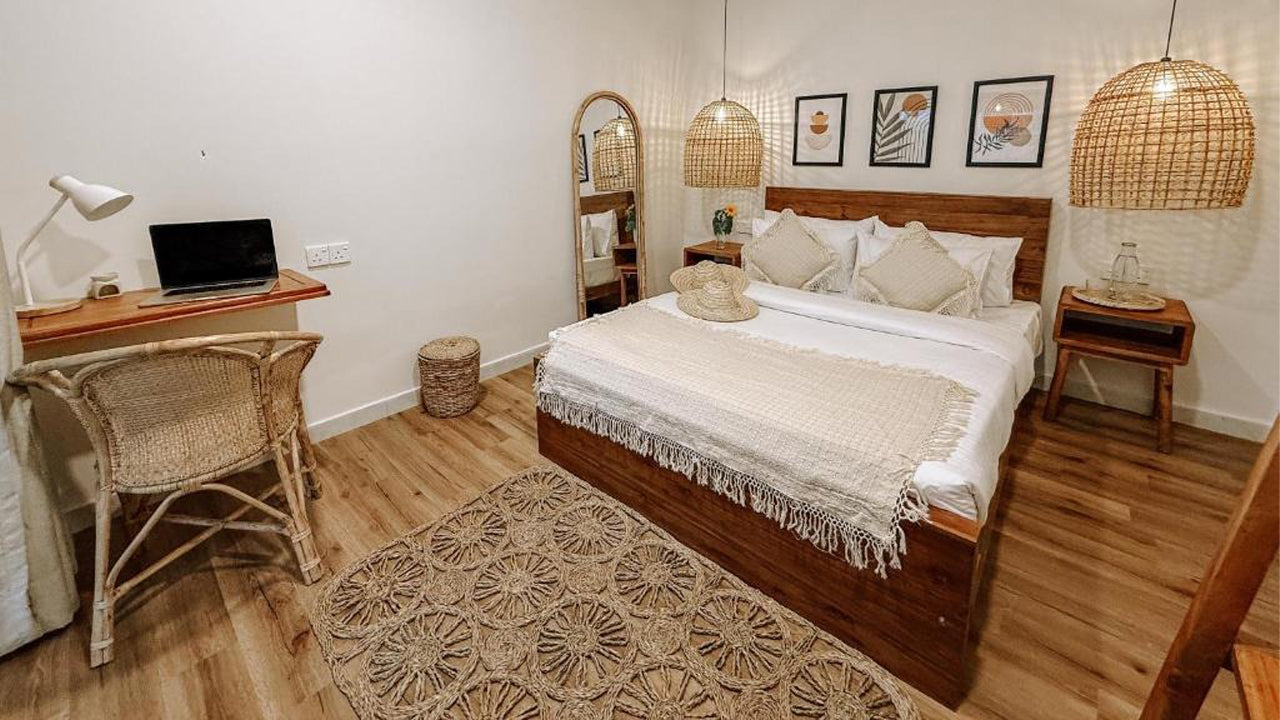 The retreat features beautifully curated rooms that combine simplicity with elegance. Each space includes soft bedding, thoughtfully designed interiors, natural light, and calming outdoor areas that reflect the essence of sustainable, mindful living.