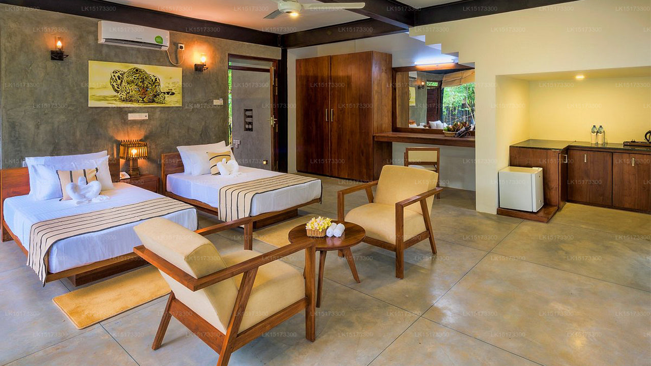 Located near the bustling town of Embilipitiya, Thuduwa Camp is perfectly situated for easy access to Udawalawe National Park, known for its large elephant population and diverse array of wildlife. The camp’s remote location near the park allows guests to feel fully immersed in the natural beauty and tranquility of the area.