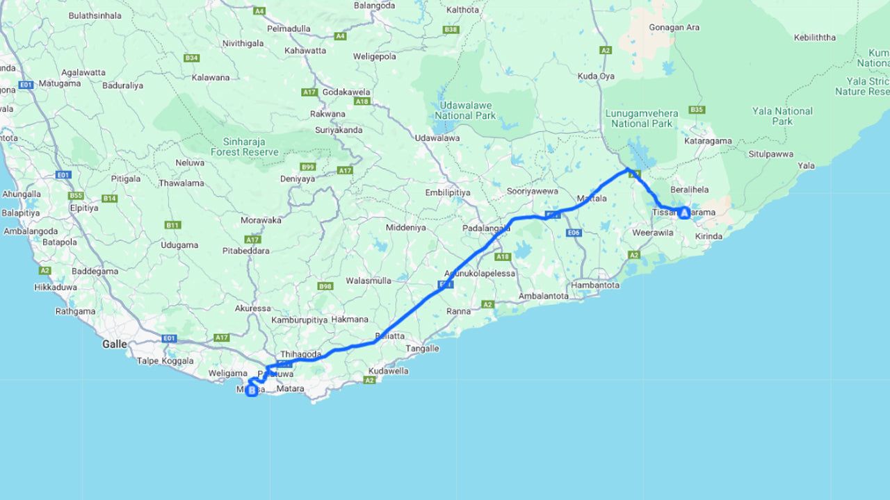 - Pick-up within the city limits of Tissamaharama and drop-off within the city limits of Mirissa.