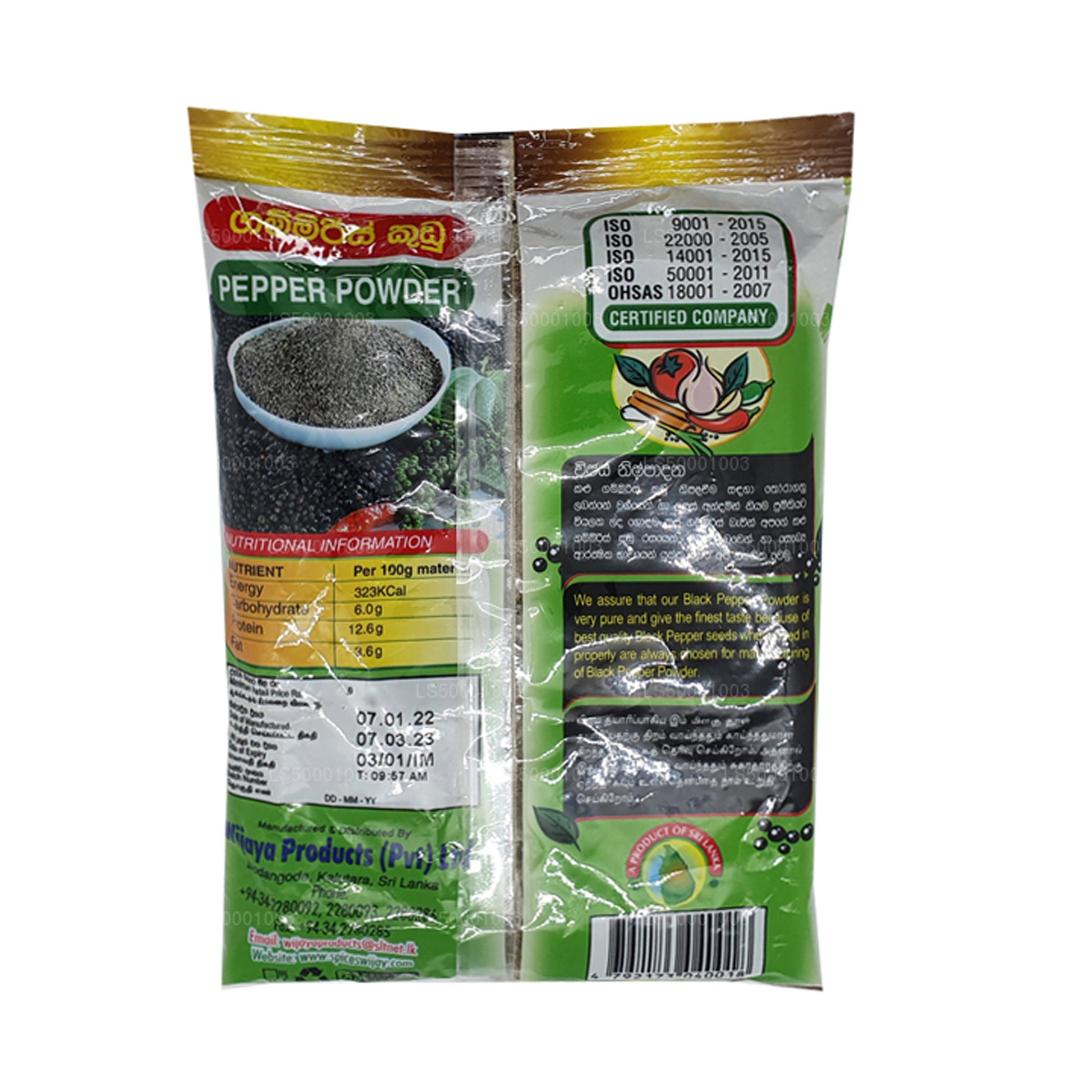 Wijaya Pepper Powder is manufactured using grade 1 pepper seeds produced in Kandy & Matale Districts to offer best quality product to our valued customers. Pepper seeds are thoroughly examined for fungal infestation and other impurities before grinding. Wijaya Pepper Powder is packed in laminated pouches to protect its freshness for a long period.
